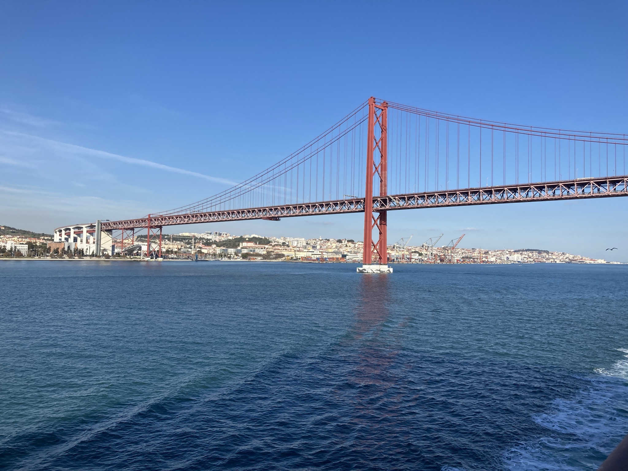Eine gewaltige Brücke unterqueren auch riesige Kreuzfahrtschiffe und sofort werden alle an die „Golden Gate Brigde“ erinnert werden wie auch bei der großen Christusfigur von Lissabon an Rio de Janereiro.